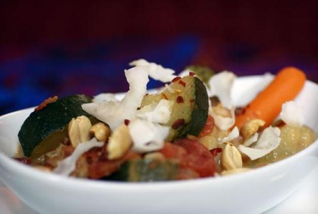 Savory, scrumptious, and creamy coconut-based curry served right in the pumpkin!