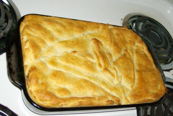I really improvised with this recipe, but it came out really good. I like pot pie's, but they take annoying long to make with having to make a pie crust, roll it out, etc. I really like the premise of the easy biscuit top in this recipe. I used a regular drop biscuit recipe and just kind of plopped and spread it accross the top and it worked perfectly. For veggies I used potatoes, carrots, celery, and broccoli becuase that is what I had. There wasn't much liquid left after simmering my veggies, so I just left in with the veggies when I poured them in the casserole dish and made up my gravy with a new batch of broth...it was perfectly saucy this way.