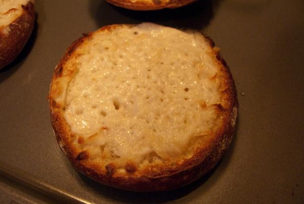 3. Put bread onto a baking sheet, and into oven for 10 minutes. Then set to broil for 2 to 3 minutes, just until the cheese is evenly melted. Watch the bread closely during the broil phase so it doesn't burn.