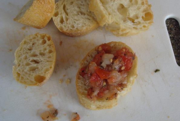 4. Add minced garlic to bowl of tomato/onion mixture. Place bread on a platter and spoon tomato/onion mixture over pieces.