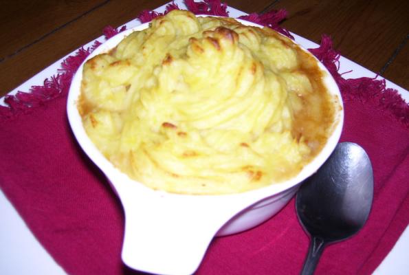 7) Remove soup from burner and pour into medium sized onion soup bowls. Pipe mashed potatoes on top of soup, gently squeezing in a circular motion. Return to oven and broil until potatoes are golden brown on top, about 15 minutes.