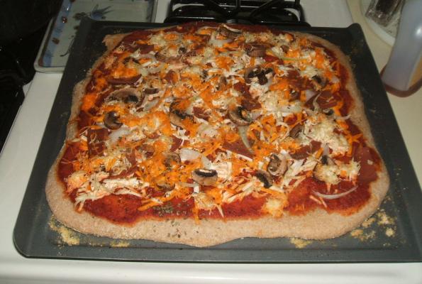 Oh, this was sooo yummy. I used 2 cups whole wheat flour and 1 cup white flour, simply because I didn't have enough whole wheat. It came out abosolutely perfect. I topped it with spinach, onion, green bell pepper, scallions, tomato and BBQ tofu cubes. MMMM. :)>>>