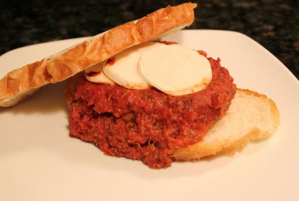 I think this would really be better over pasta. I didn't have any noodles which is why I made a sandwich out of it. But, let me know how it is either way!