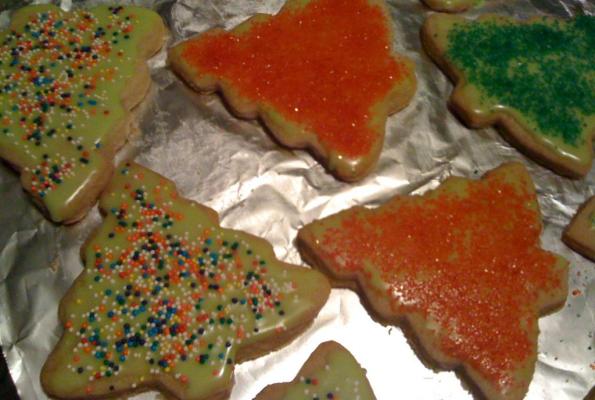 4. For frosting, mix powdered sugar, almond extract, light corn syrup, and milk in a bowl. Add food coloring if desired. Frost cookies.