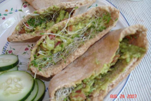 Combine all ingredient except sprouts and pita. You can add more or less or completely omit whatever you choose. After everything is mixed cut pita in half. Put one half inside the other. Add the mixture and some sprouts, and you are ready to feast.