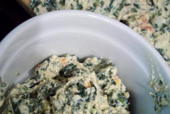 3. Combine all other ingredients in a food processor and blend until smooth. Stir spinach and tofu mixture together and place in small glass pan and sprinkle vegan cheese on top.