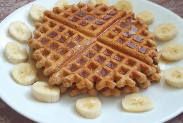 2. Blend banana in blender. Preheat waffle iron according to manufacturer's directions. Pour batter into the blender a little at a time and blend thoroughly with banana.