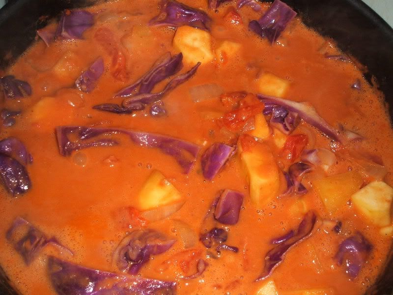 I just wanted to say that I tried this recipe last week and it's faaaantastic! I've already made it a couple times and it's going to be a regular in my house from now on, esp as the weather starts to get colder and wetter. The one change I made was to cut the cabbage much less finely than suggested. I'll admit that I did it 'cause I misread the recipe the first time I made it, but the stew was so good (and attractive!) with chunky strips of purple in it, that I'm going to continue making it my way. :) Many thanks Veggydog for posting this, you should totally submit it!