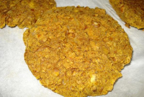 In large bowl, mash beans. Mix in crumbled vegan bread, onions and spices. Mix thoroughly, and add just enough cracker crumbs to make patties capable of holding together. Form mixture into patties or balls. (These can be coated with more cracker crumbs, if desired.)