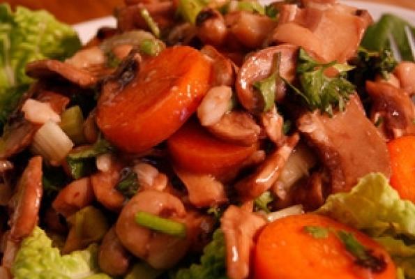 3. Put the vegetables, cooked peas and marinated mushrooms in a bowl, and stir in the sauce to coat them. Add parsley, cilantro, and season, to taste.