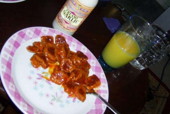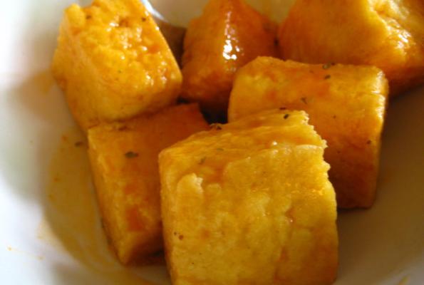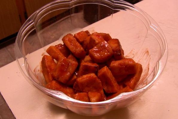 3. Melt the margarine in the microwave, add the hot sauce and stir. When the tofu is done place it in the sauce. Make sure the tofu is covered. If you like it hotter or milder just change the ration of hot sauce to margarine.