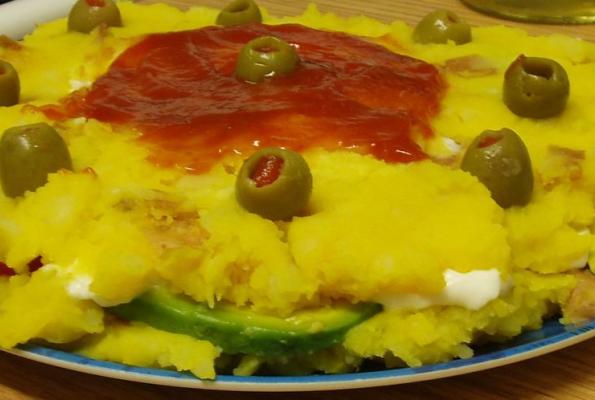 This dish is made in Peru with a few different fillings: either a salad of chicken, chopped celery, and mayonnaise (with infinite variations), a mayonnaisey tuna salad, or vegetables, as above. Sometimes peas are included in any variation. Do include the avocado-- it's really special.