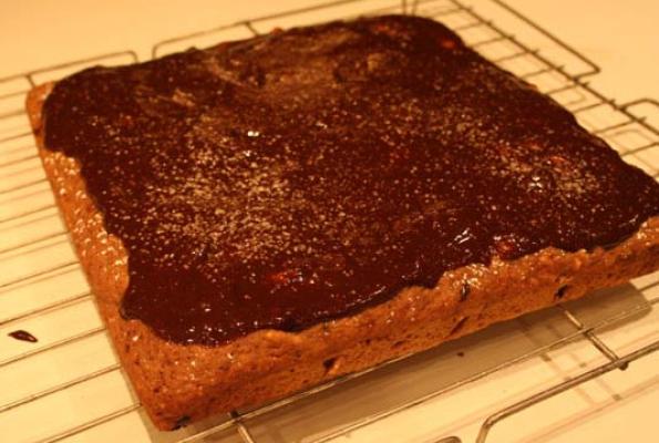 Good cake! Mine I messed up a bit cause I put 3 tsp instead of 3 tbsp of cocoa, so I made a chocolate icing and put it on top. As well, I put slivered almonds in the batter. Came out well in the end. Odd texture though, it was like rubbery and moist at the same time.