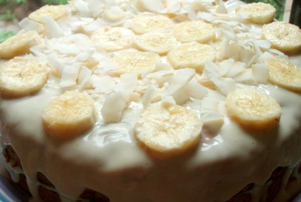 I also added fresh sliced banana and toasted coconut flakes on top of the icing to make it pretty and that much more delicious! Enjoy!