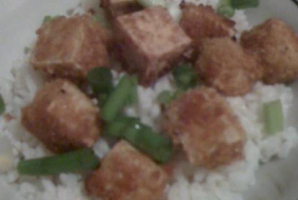 5) Dish rice into bowls and top with fried tofu and either green onion or cilantro for color and an extra zip. Enjoy!