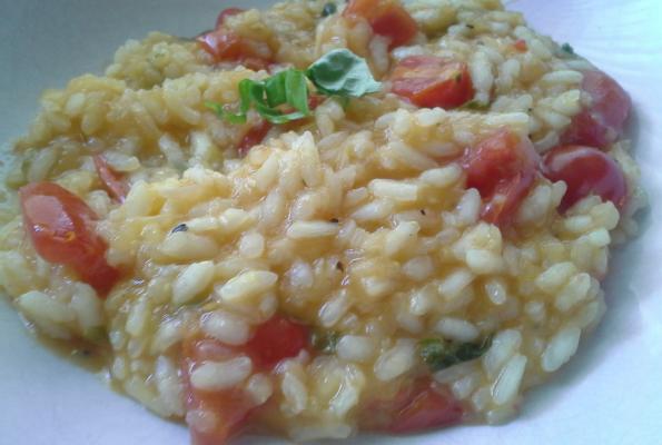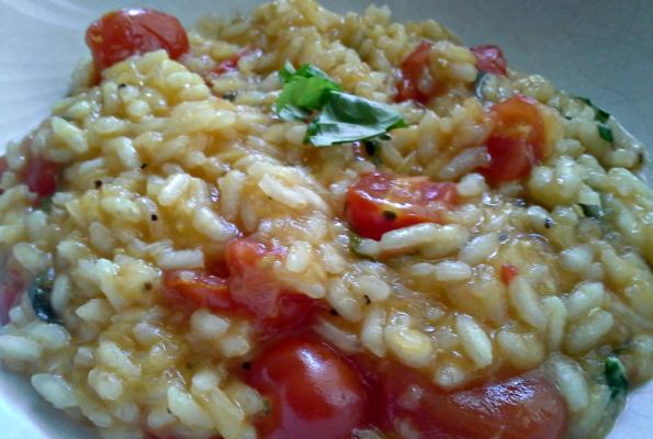4. After about the third ladle of stock, add your tomatoes and some ribbons of basil. Keep stirring and adding your stock until the rice is tender but not mush. You don't want mush.
