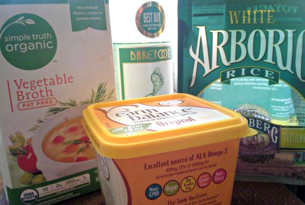 2. Meanwhile gently heat the veggie stock in another pan, keep on low. Add arborio (about 10 ounces) to onion and celery mix, stir to cover with oil and Earth Balance and let cook for a minute or two. Reduce heat a little.