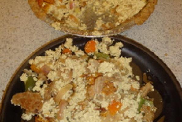 2. On a very floury surface, roll out your dough into a flat round that is about 1/8 to1/4 inch thick. Carefully lift it and place it into a 9" pie or tart pan. Place in the fridge to set.Or, use your own favorite crust, but follow its directions for use (for example, does it need to be toasted for ten minutes before pie filling enters it?, etc....)