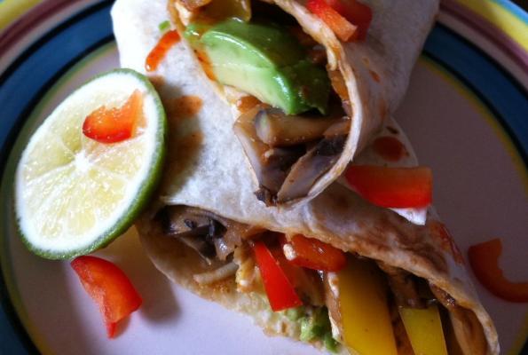 4. Add filling to tortillas, and top with avocado and vegan sour cream.