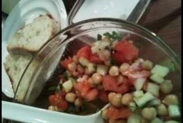 4. Serve at room temperature, preferably when you just get home from the Farmer's Market where you got your veggies. I served this for a light summer lunch with some other things we picked up - sliced ciabatta bread, garlic spread and hot pepper jelly. We also had some mixed olives in the fridge so we had some of those too.