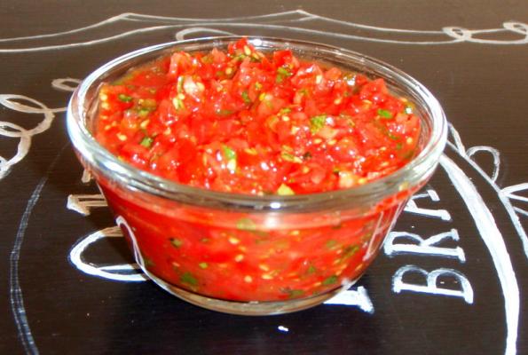 Mix all ingrediants in a food processor and blend to how chunky you like it. Adjust ingrediants based on how hot you want it.