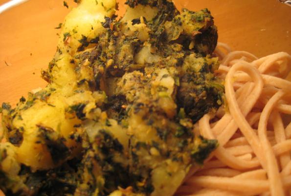 3. When spinach is soft, add potatoes. If it looks to dry, add a bit more oil. It should have a thick, yet moist consistancy.