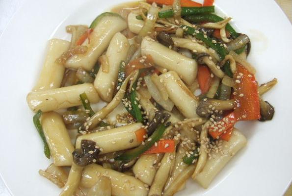I was so happy to find an asian recipe that doesn't use a hot sauce, due to a medical problem I can not have anything hot & spicy. I did not like the vegetables in the recipe so what I used was one white onion, 2 cloves garlic, broccoli, green beans, 1 can of bamboo shoots and carrots. I cooked it in Toasted Sesame seed oil, and dumped a bunch of sesame seeds on top of everything. I found a 2 LB bag of rice cakes so I used the whole thing. Used 1/3 cup sugar and 1/3 cup low sodium soy sauce, the sauce and vegetables are delicious. However I have never had rice cakes before so I do not know what they are supposed to taste like. I did boil them in some water first cause they were hard, but I wasn't sure exactly how long I should've done that for. I don't know if the rice cakes are done or not, but if they are I do not like the way they taste, not that they have much of one. I will do exactly what I did next time except maybe add a red bell pepper & minus the rice cakes.