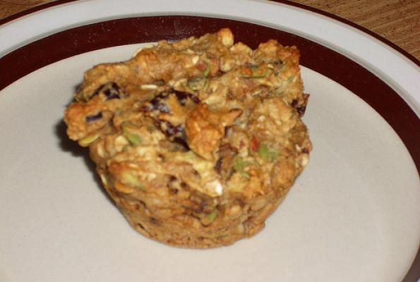 Amazing. Seriously. I was a little scared at first because they didn't look like muffins (they don't rise much during baking), but they taste sooooo good and the texture is fantastic! I used chocolate chips instead of carob (sorry, I just like it more), and I think I may have used upwards of 3/4 cup. I used brown rice syrup instead of agave. I used some premixed trail mix for the dried fruit and nuts. I got 8 JUMBO muffins (perfect size for a very filling, healthy breakfast on the go!), and they took around 30 minutes to bake. I think next time I'll try walnuts and dried cranberries, and I am going to try to replace the oil with applesauce (I figure the peanut butter adds enough fat). As a student who is always looking for quick, healthy foods (especially healthy foods that cure my incessant sweet tooth), I can guarantee you I will be making these many times in the future!!!