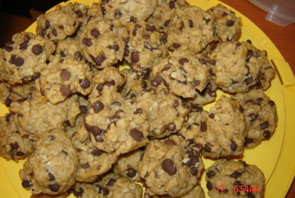 3) Combine flour, salt, baking soda, and cinnamon in separate bowl and mix well. Add to wet ingredients and mix well. Add oatmeal and chocolate chips and mix well.