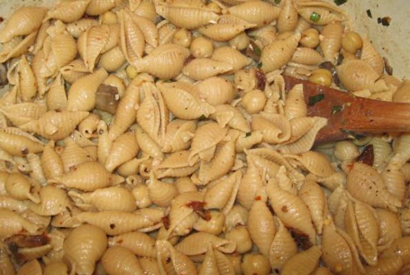 Heat olive oil in small pan and add garlic. Saute garlic. Do NOT let brown. Add mushrooms and saute minute more. Add re-hydrated tomatoes, including the soaking water. Rinse garbanzo beans and add to mixture. Simmer lightly till pasta is finishe'd cooking.