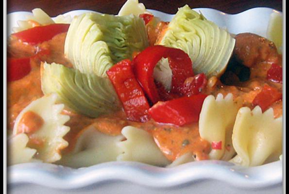 2. Process to a smooth consistency. Drain the pasta and toss with the sauce, then add the artichokes.