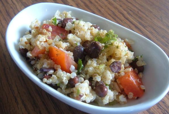 3. Combine cooled quinoa, beans, tomatoes, and green onions in a large bowl.