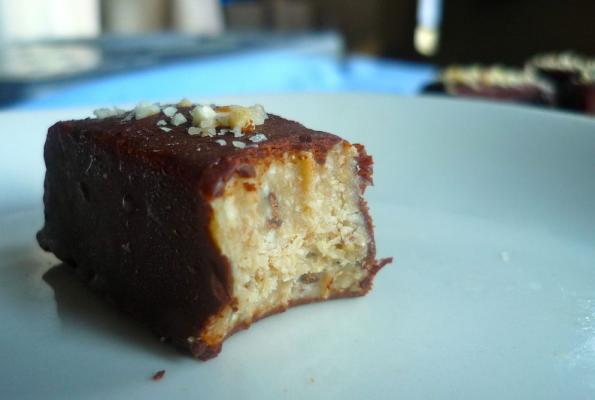 4. One by one, dip each bite into chocolate, place on a flat tray and freeze for 1-2 minutes. Dip again in chocolate and top with chopped cashews, or other desired topping. Freeze until frozen.