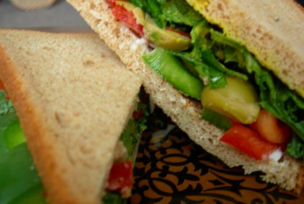 Last, dribble the balsamic dressing over the veggies, top with the sprouts (or other greens), close the sandwich and devour.