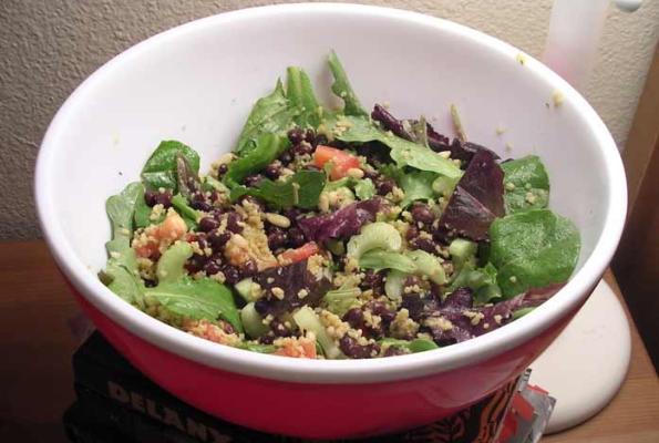 Once the dressing is done, toss it with the salad ingredients and you have an easy, hearty, protein-full dinner! We eat this as often as 3 or 4 nights a week, sometimes.