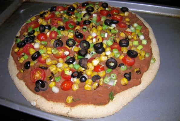 Roll the dough out onto a baking stone or baking sheet, spread the beans fairly thick and top with corn, scallions, tomatoes, olives, and any other veggies you like. Can add vegan cheese substitute or nutritional yeast on top of this if you want, but its okay without it, too. Sprinkle with crushed red pepper and bake at 400 degrees for about 20 minutes or until crust is fairly crispy.