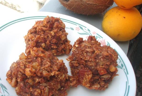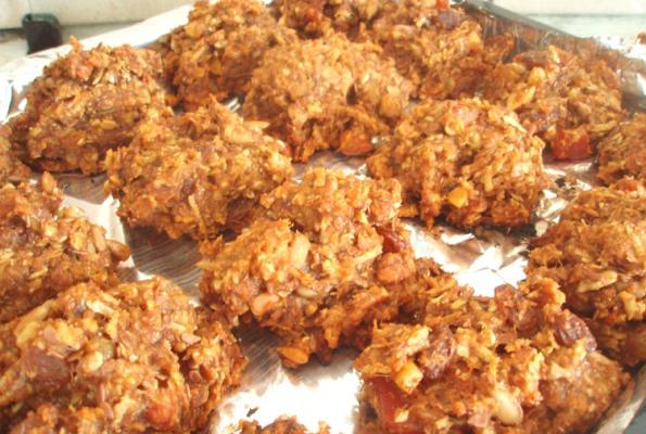 Source of recipe: The basis for this recipe came from an oatmeal cookie recipe in the Betty Crocker cookbook. I veganized it, and added a bunch of nutrition that I had on hand (substituting the flours, eggs, and butters, and adding the seeds and nuts). What turned out was a yummy, chewy, cereal bar type cookie. The dough can also be pressed into a shallow cookie pan, baked, and cut into cereal bars.