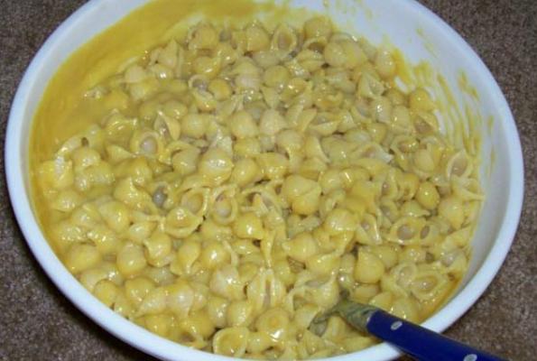 Sauce: Mix the yeast and flour together in a pot, add half the water, heat it up and whisk it when it starts to boil. Add the rest of the water, whisk until there are no lumps. Turn off the heat and stir in the mustard, garlic salt, onion powder and yellow food coloring. Pour over noodles and enjoy=)
