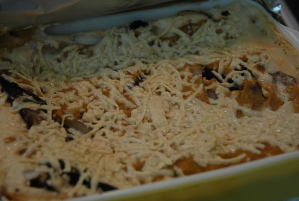 4. Repeat, starting with pumpkin puree, lasagna noodles, ricotta mix, mushrooms and onions until you reach the top. Top the final layer with pumpkin puree, mushrooms and onions sprinkle with the remaining mozzarella cheese. Bake covered for 20-25 minutes. Remove foil and bake additional 15 minutes.