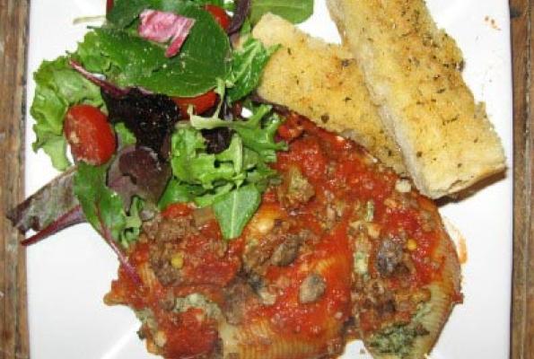 In a large pot boil the Shells as directed on the package. Drain and rinse under cold water to cool off enough to handle them. Place enough spaghetti sauce on the bottom of an 8 X 12 baking dish just to cover. Stuff the shells with the Ricotta mixture. When you are done stuffing the shells place the rest of the spaghetti sauce over the shells. Cover with foil and bake for 30 minutes. Let cool for at least 10 minutes before serving.